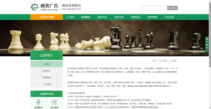 深圳市創(chuàng)茗廣告有限公司創(chuàng)立于2006年,我們擁有國(guó)內(nèi)高端雜志(航空、經(jīng)管、金融、時(shí)尚等)、主流報(bào)紙媒體、網(wǎng)絡(luò)媒體、電臺(tái)、戶外、空港/高鐵/地鐵/公交/框架等核心資源,依托大數(shù)據(jù)分析及互聯(lián)網(wǎng)技術(shù),從營(yíng)銷策劃、創(chuàng)意,到推廣落地,為企業(yè)提高全方位的整合營(yíng)銷推廣服務(wù)。